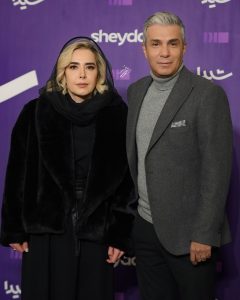 تصویری از آریا عظیمی نژاد و همسرش در حاشیه یک رونمایی از پلتفرم شیدا را مشاهده میکنید.