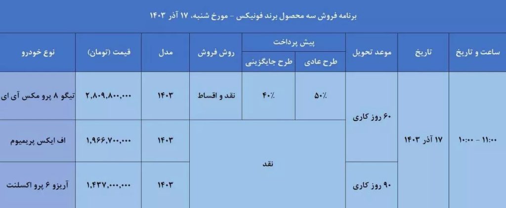 برند فونیکس از ساعت ۱۰ روز شنبه، ۱۷ آذر اقدام به فروش سه محصول خود با موعد تحویل ۶۰ و ۹۰ روزه به صورت نقد و اقساط خواهد کرد.