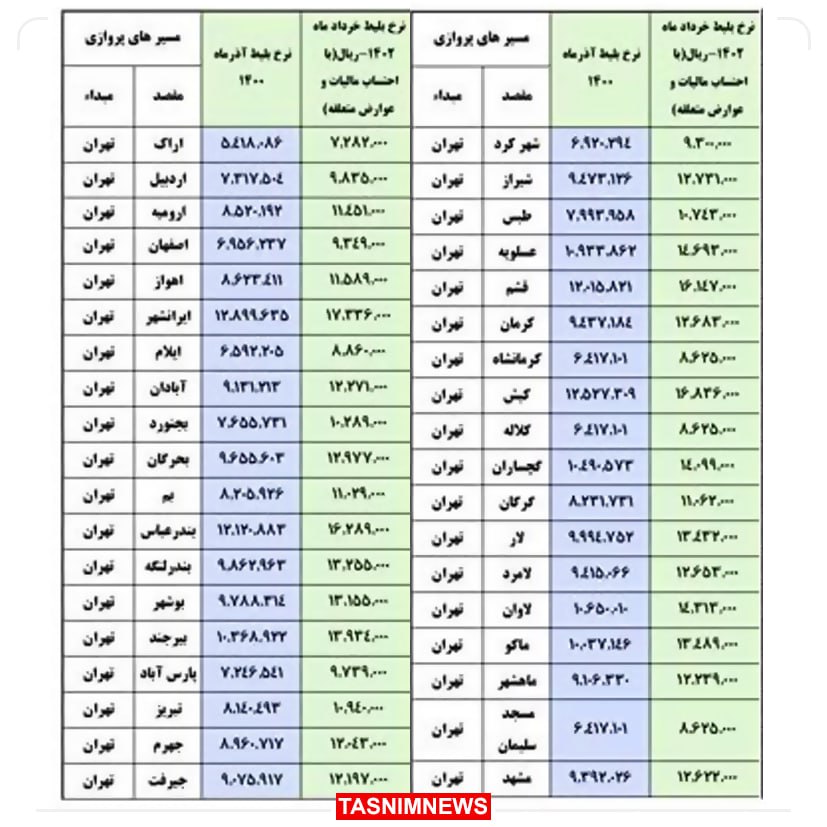 اصلاح شبانه و فوری قیمت بلیت هواپیما + جدول قیمت جدید