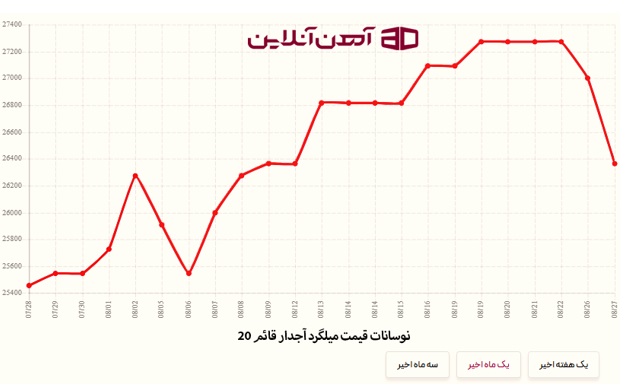 روند قیمتگذاری محصول میلگرد در روز جاری با کاهش قیمت همراه بود و میتوان این را گفت که اکثر شرکتهای تولیدکننده با این کاهش قیمت دستبهگریبان بودند. بیشترین کاهش قیمت مربوط به میلگرد قائم بود که در ۹۹ درصد سایزهای میلگرد تولیدی خود با کاهش ۲.۴ درصدی مواجه بود. بهعنوانمثال میلگرد سایز ۲۰ این شرکت با کاهش قیمتی که به همراه داشت، قیمت ۲۶ هزار و ۳۶۰ تومان را ثبت کرد.