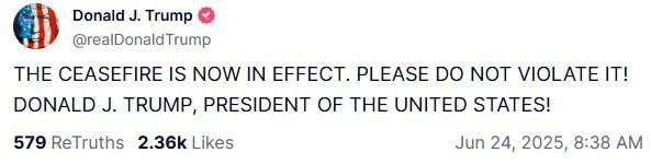 به گزارش اقتصاد ایران، دونالد ترامپ  رئیس‌جمهور آمریکا در پیامی نوشت: آتش‌بس اکنون برقرار شده است. لطفاً آن را نقض نکنید!