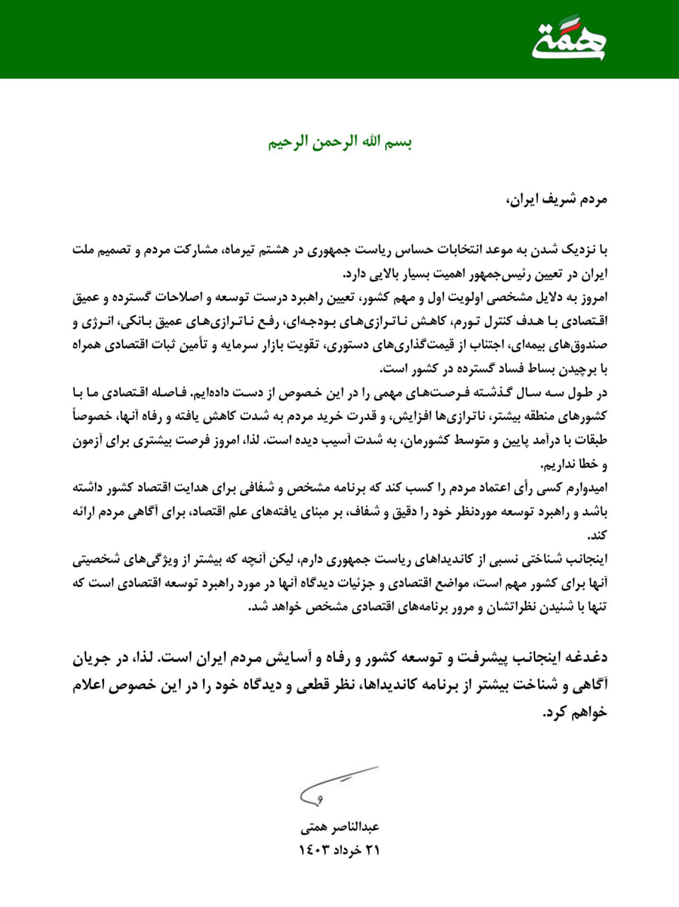 به گزارش ایسنا، عبدالناصر همتی در ابتدای این بیانیه یادآور شده است: «با نزدیک شدن به موعد انتخابات حساس ریاست جمهوری در هشتم تیرماه مشارکت مردم و تصمیم ملت ایران در تعیین رئیس جمهور اهمیت بسیار بالایی دارد.»