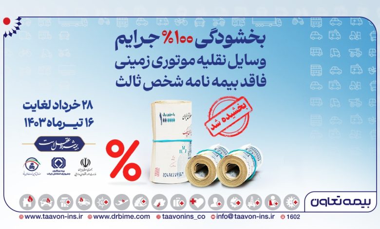 طرح بخشودگی ۱۰۰ درصد جرایم وسایل نقلیه فاقد بیمه شخص ثالث به مناسبت دهه امامت و ولایت به مدت ۲۰ روز، از تاریخ دوشنبه ۲۸ خرداد لغایت ۱۶ تیر ماه ۱۴۰۳ اجرا میشود.