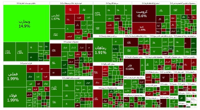 فولاد، فملی و وتجارت بیشترین تاثیر مثبت را بر شاخص کل بورس داشتند. همچنین وتجارت، فملی و فاذر از نمادهای پرتراکنش بودند.