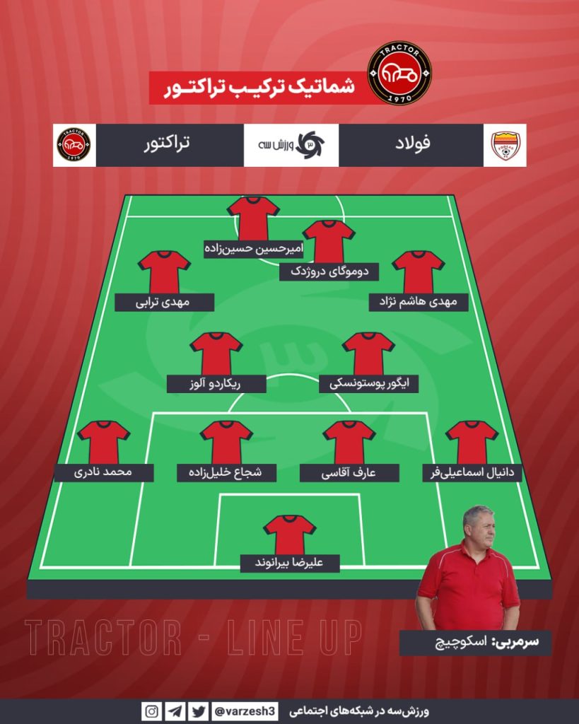 در خط هافبک، ایگور پوستونسکی و ریکاردو الوز زوج خود را تشکیل می‌دهند و مهدی ترابی و مهدی هاشم‌نژاد به عنوان وینگر بازی خواهند کرد. خط آتش تراکتور هم احتمالا با امیرحسین حسین زاده و دوموگوی دروژدک تشکیل خواهد شد و اشتراکالی روی نیمکت حضوز خواهد داشت.