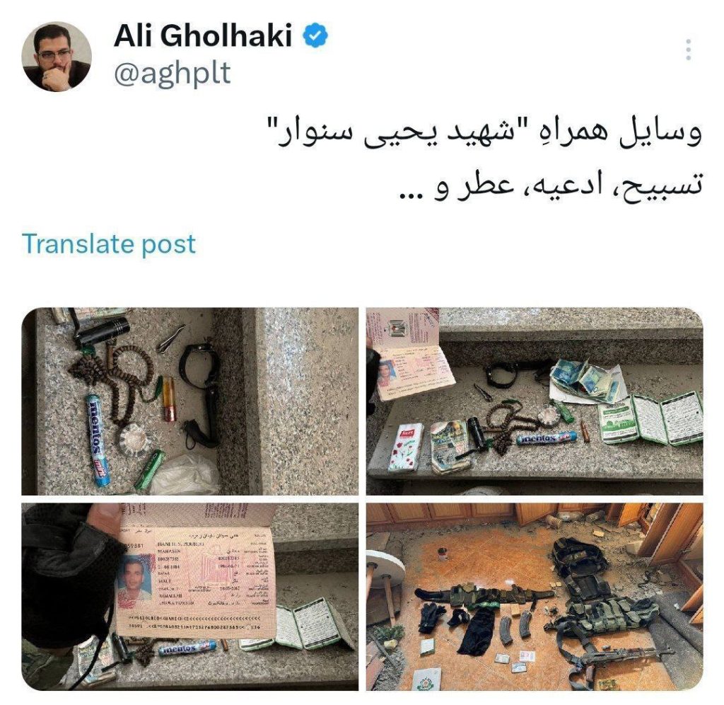 علی قلهکی، فعال رسانه‌ای تصاویری از وسایل همراه یحیی السنوار در لحظه شهادت را در یک توئیت منتشر کرد.