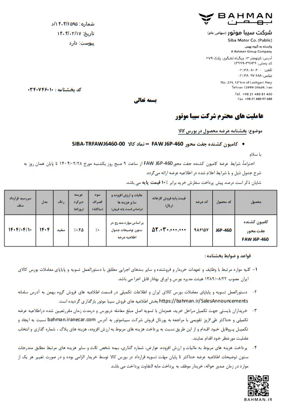 عرضه یک محصول گروه بهمن در بورس کالا از ساعت ۹ صبح روز یکشنبه مورخ ۲۸ اردیبهشت ۱۴۰۴ آغاز خواهد شد.