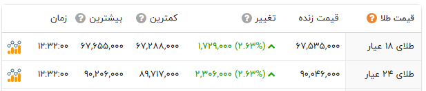 هر گرم طلای ۱۸ عیار نیز با رشد ۱۷۲ هزار و ۹۰۰ تومانی قیمت، ۶ میلیون و ۷۵۳ هزار و ۵۰۰ تومان در طلافروشی ها معامله می شود.