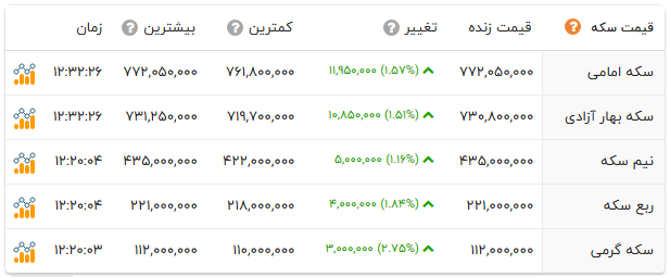 سکه امامی با رشد ۱ میلیون و ۱۹۵ هزار تومانی، ۷۷ میلیون و ۲۰۵ هزار تومان ارزش گذاری شد.