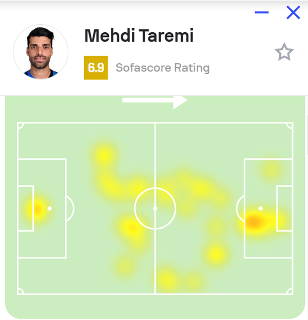 نقشه حرارتی طارمی در این بازی ثابت می‌کند که مهاجم گلزن تیم ملی ایران با انتقال به اینتر به عنوان بازیکن پشتیبان و کارگر برای لوتارو مارتینز، کاپیتان اینتر عمل می‌کند تا نتواند موقعیت چندانی برای گلزنی داشته باشد.نشریه توتو اسپورت می‌نویسد که مهدی طارمی از سوی اینزاگی به عنوان بازیکن پشتیبان برای خط حمله به کار گرفته می‌شود تا با دوندگی بالا خلا میان خط میانی و حمله را پرکند.