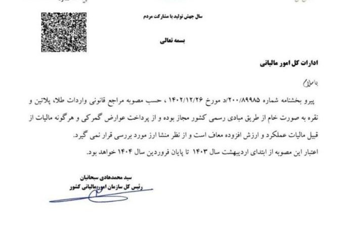 طبق ابلاغیه سازمان امور مالیاتی معافیت مالیاتی واردات طلا تا فروردین ۱۴۰۴ برقرار خواهد بود.