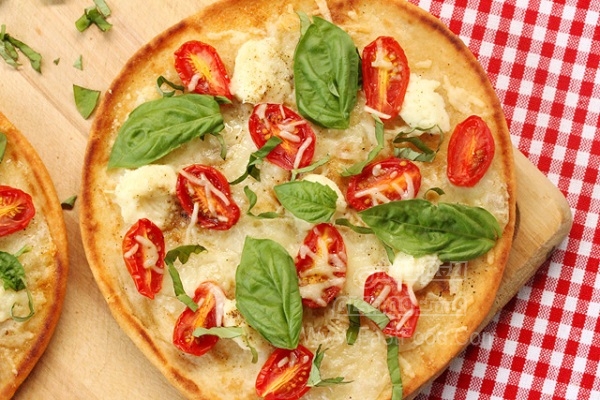 گام ۱۴  گوجه های خرد یا ورق شده و برگ های تاره ریحان را روی آن قرار دهید.