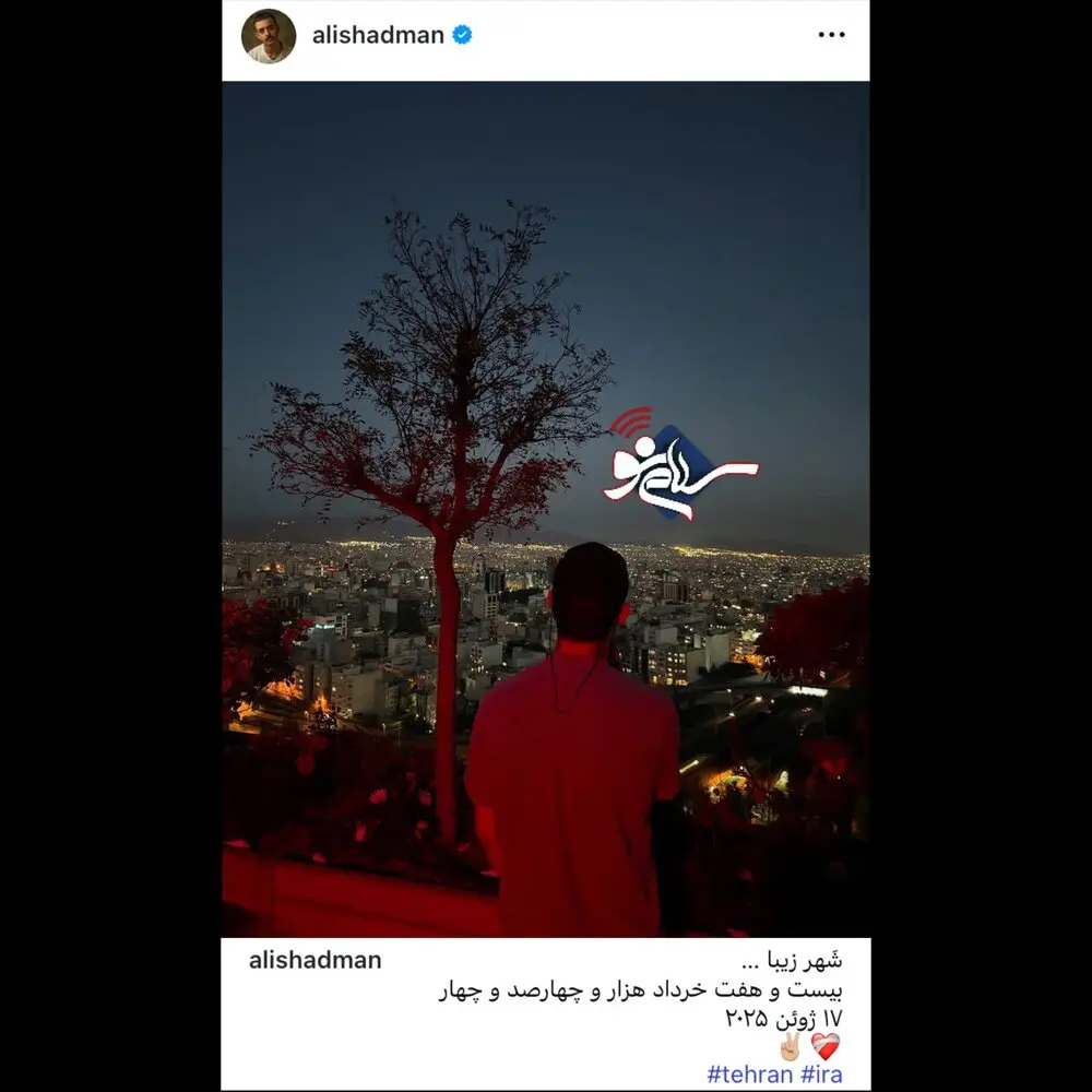 به گزارش اقتصاد ایران، به نقل از آرمان در پی حملات اخیر رژیم صهیونیستی به مناطق مختلف ایران، علی شادمان، بازیگر مطرح سینما و تلویزیون، با انتشار تصویری از خود در بام تهران در صفحه اینستاگرامش، واکنشی هنری و معنادار نشان داد. در این تصویر، او با نگاهی خیره به افق تهران ایستاده و سکوت تصویر، گویای اندوه و تأملی عمیق است.
