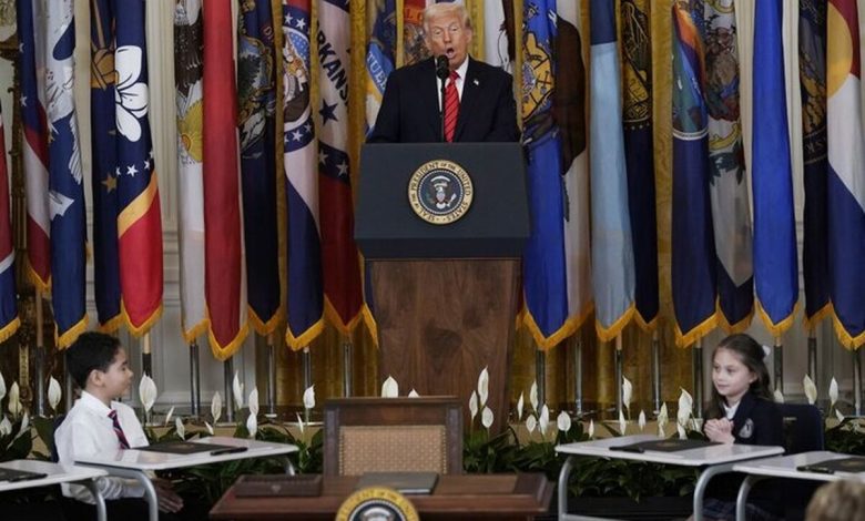 دونالد ترامپ رئیس جمهوری آمریکا روز پنجشنبه به وقت محلی در کاخ سفید در حالیکه فرمان انحلال وزارت آموزش و پرورش کشورش را امضا کرد که دانش آموزانی در اطراف او حضور داشتند و به آنها اعلام شده بود که رفتار ترامپ را تکرار کنند.