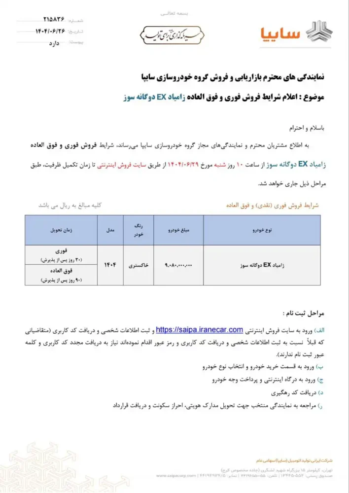 متقاضیان این طرح از ساعت ۱۰ روز شنبه مورخ ۲۹ شهریور ماه در سایت فروش شرکت سایپا نسبت به ثبت نام اقدام نمایند. نکته حائز اهمیت درباره این خودرو این است که تنها در رنگ خاکستری عرضه خواهد شد.