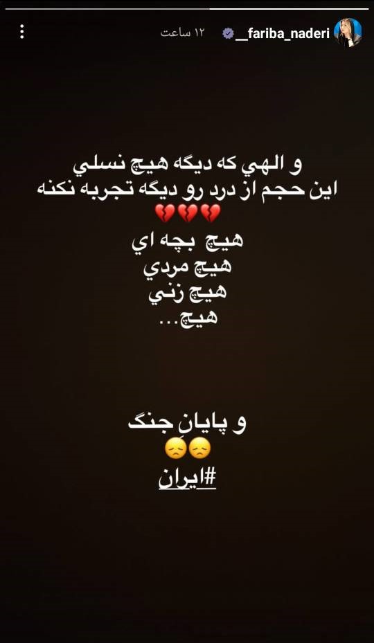 فریبا نادری بازیگر و هنرمند مشهور با این استوری از روز‌های تلخ جنگ خداحافظی کرد.