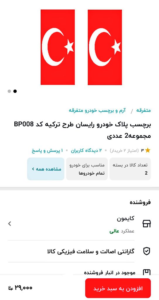 به گزارش اقتصاد ایران، برایم سوال بود برچسب‌های پلاک خودرو با پرچم ترکیه برای حذف پرچم ایران از پلاک خودرو توسط پانترکها از کجا تهیه میشود؟ دوستی خبر داد دیجی کالا این کالای ضدملی را به فروش می رساند!