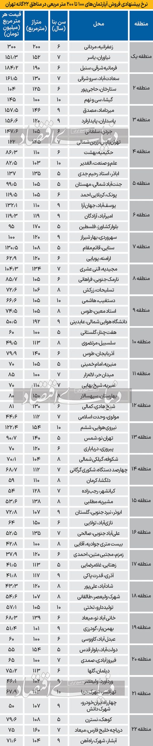قیمت آپارتمانهای بالای۱۰۰متر در نقاط مختلف تهران+ جدول