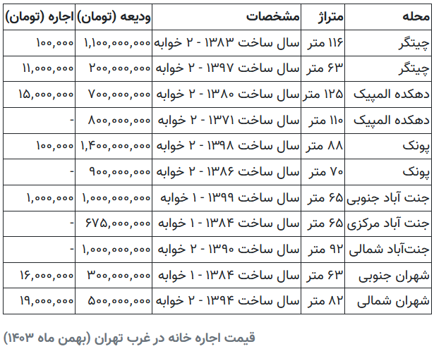 در جدول زیر جدیدترین قیمت اجاره خانه در محلههای مختلف غرب تهران را میتوانید بخوانید؛