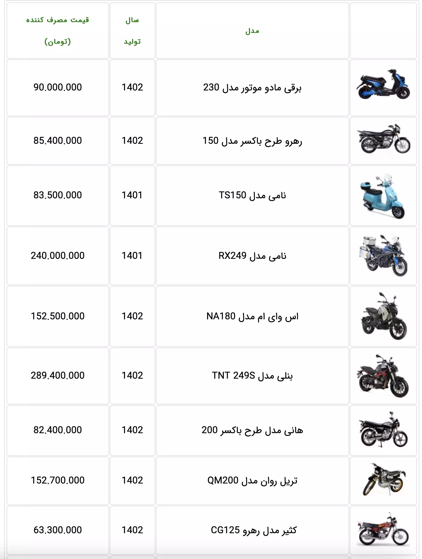 قیمت جدید انواع موتورسیکلت اعلام شد