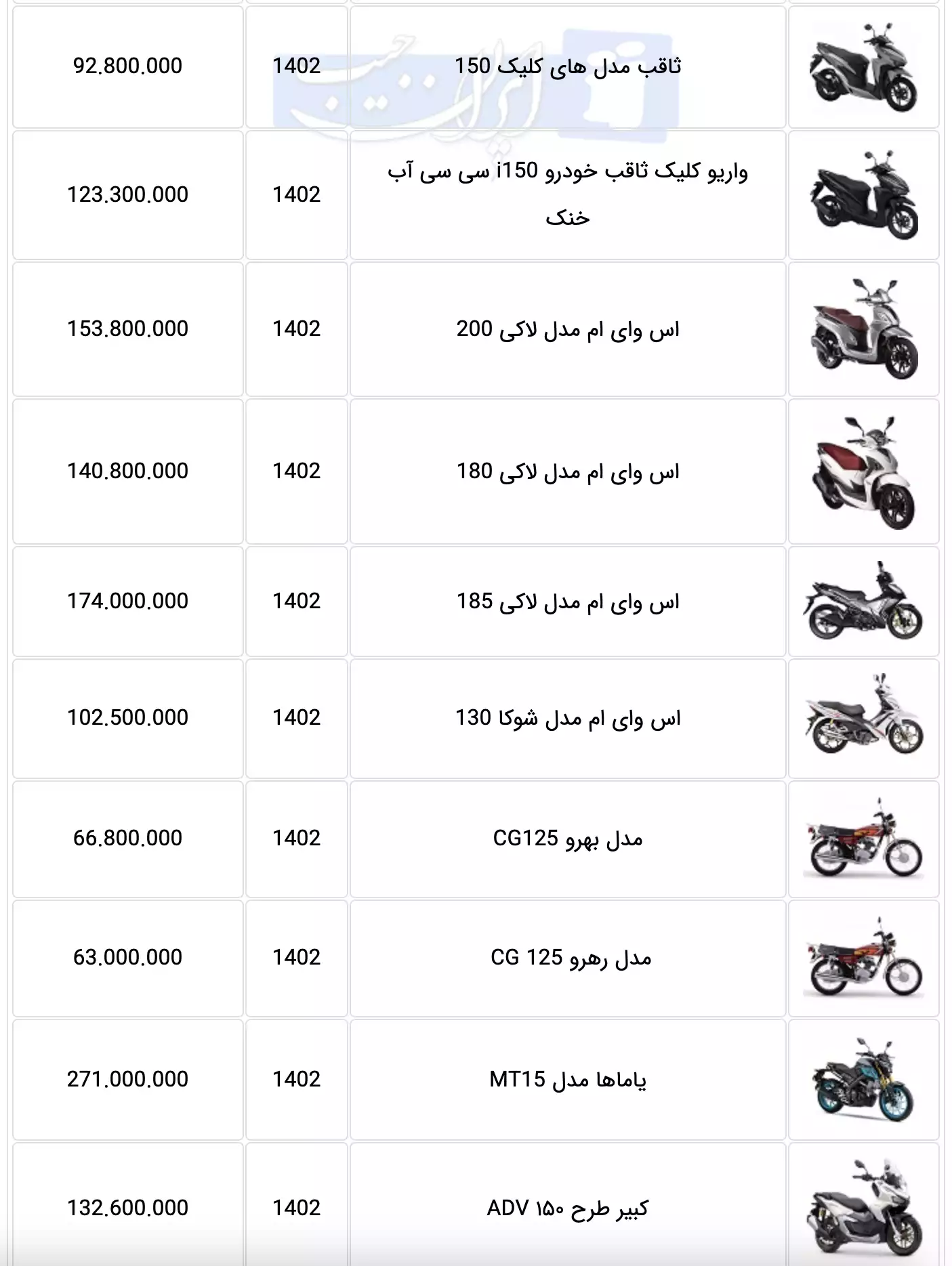 به گزارش اقتصاد ایران، جدیدترین قیمت انواع موتورسیکلتهای موجود در بازار تهران ویژه آبان ماه ۱۴۰۲ منتشر شد.