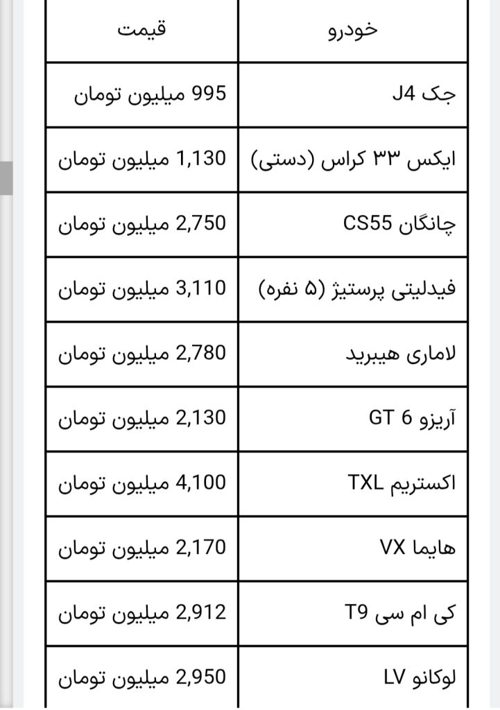 از سوی دیگر، برخی خودروهای مونتاژی کاهش قیمت قابل توجهی داشتند. به طور مثال، اکستریم TXL با ۹۰ میلیون تومان کاهش، قیمتش به چهار میلیارد و ۱۰۰ میلیون تومان رسید. چانگان CS55 نیز نسبت به روز گذشته ۶۵ میلیون تومان ارزانتر شده.و با نرخ دو میلیارد و ۶۷۵ میلیون تومان در بازار عرضه شد.