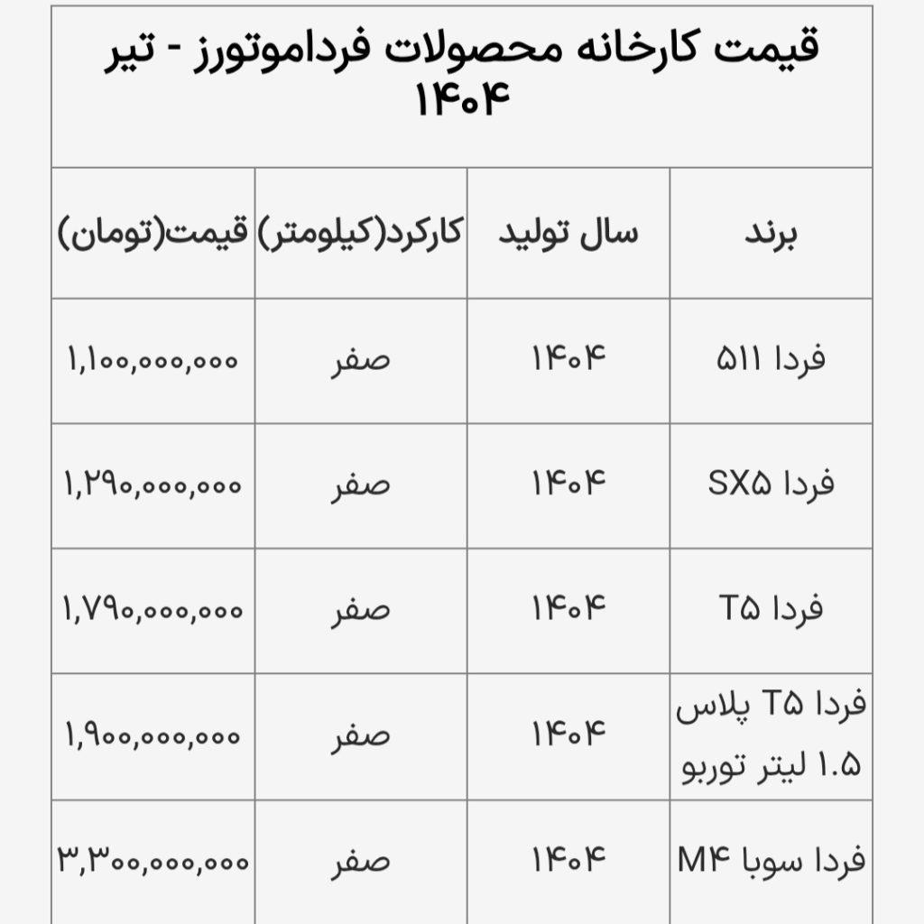 همچنین درصورتی که قصد خرید فردا T۵ پلاس ۱.۵ لیتر توربو مدل ۱۴۰۴ از کارخانه فرداموتورز را داشته باشید.باید چیزی حدود ۱ میلیارد و ۹۰۰ میلیون تومان هزینه کنید. فردا سوبا M۴ مدل ۱۴۰۴ نیز در نمایندگی های فراموتورز حدود ۳ میلیارد و ۳۰۰ میلیون تومان قیمت دارد. جهت اطلاع از قیمت کارخانه محصولات فرداموتورز در تیر ۱۴۰۴ جدول زیر را بخوانید.