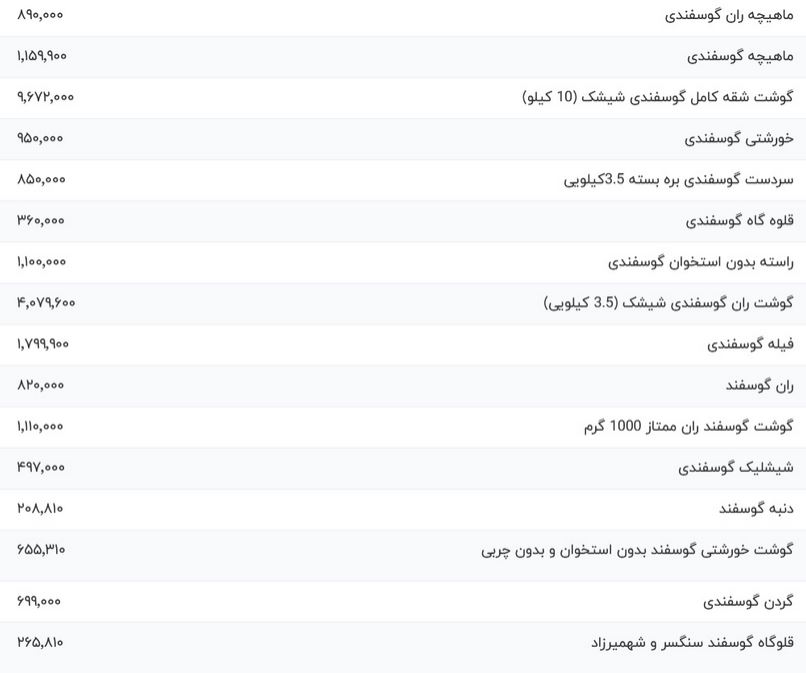 قیمت گوشت قرمز، امروز ۱۹ فروردین ۱۴۰۴ شامل گوسفند زنده، ران گوسفندی، سردست گوسفندی، دنبه گوسفندی، قلوه گوسفندی، شقه گوسفندی، پرده گوسفندی، چرخ کرده گوسفندی بدون چربی و فیله گوسفندی اعلام شد.