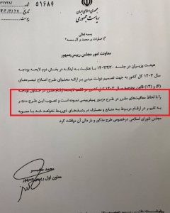 در بخش دیگر این نامه آمده است: تصویب این طرح منجر به تغییر در ارقام مربوط به منابع و مصارف در ردیفهای ذیر ربط نخواهد شد و با مصوبه مجلس در خصوص طرح مذکور و بار مالی آن موافقت کرد.