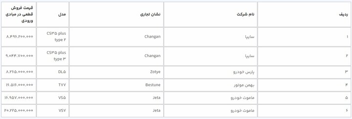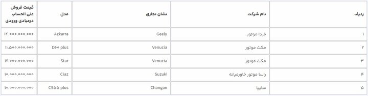 تبصره: قیمت مندرج در جدول شماره ۱، قیمت قطعی در مبادی ورودی بوده و هزینه‌ها و عوارض قانونی پس از ترخیص از قبیل: بیمه شخص ثالث، مالیات بر ارزش افزوده، هزینه‌های شماره گذاری، اسقاط خودروی فرسوده، کرایه حمل و … به قیمت‌های فوق اضافه می‌گردد.