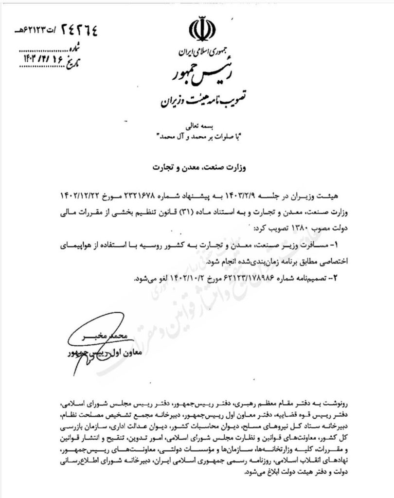 هیئت وزیران به عباس علی آبادی وزیر صنعت، معدن و تجارت اجازه داد تا با هواپیمای_اختصاصی به کشور دوست و برادر روسیه سفر کند.