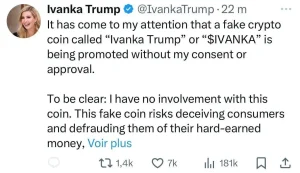 ایوانکا ترامپ (دختر دونالد ترامپ): "من متوجه شده ام که یک ارز دیجیتال جعلی به نام "ایوانکا ترامپ" یا " $IVANKA " بدون رضایت یا تایید من در حال تبلیغ است.