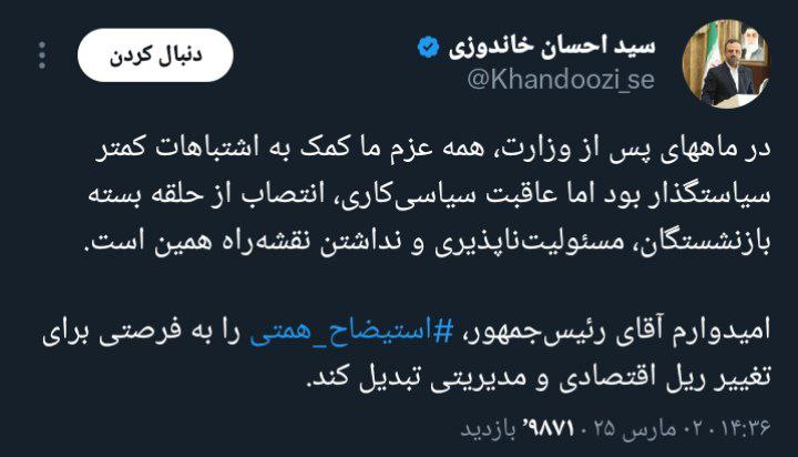 خاندوزی در واکنش به استیضاح همتی گفت: امیدوارم آقای رئیس جمهور استیضاح همتی را به فرصتی برای تغییر ریل اقتصادی و مدیریتی تبدیل کند.