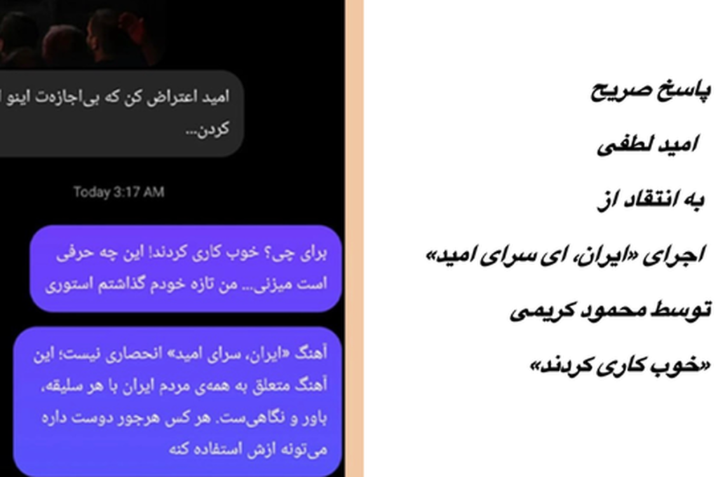به گزارش اقتصاد ایران، امید لطفی فرزند استاد محمدرضا لطفی در واکنش به پیام یکی از کاربران که خواستار اعتراض به اجرای بدون اجازه قطعه «ایران،ای سرای امید» توسط محمود کریمی شده بود، با لحنی صریح پاسخ داد: «خوب کاری کردند!»