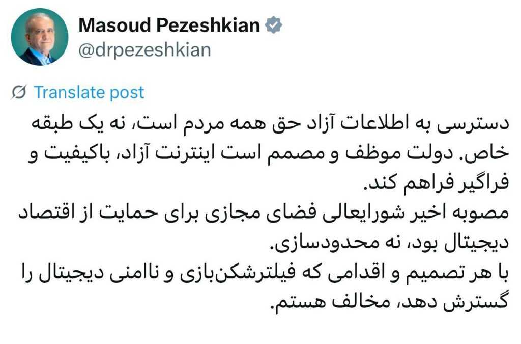 مسعود پزشکیان، رئیس جمهور نسبت به شایعه طبقاتی شدن اینترنت در ایران واکنش نشان داد.