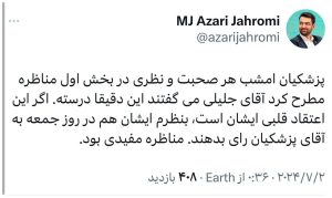 واکنش جنجالی آذری جهرمی درباره مناظره پزشکیان! + عکس