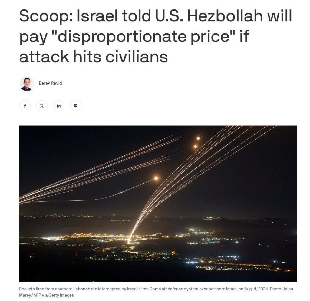 اسرائیل در پیامی به آمریکا: اگر حزب الله، غیرنظامیان را هدف قرار دهد، این سازمان “بهای نامتناسب” پرداخت خواهد کرد.