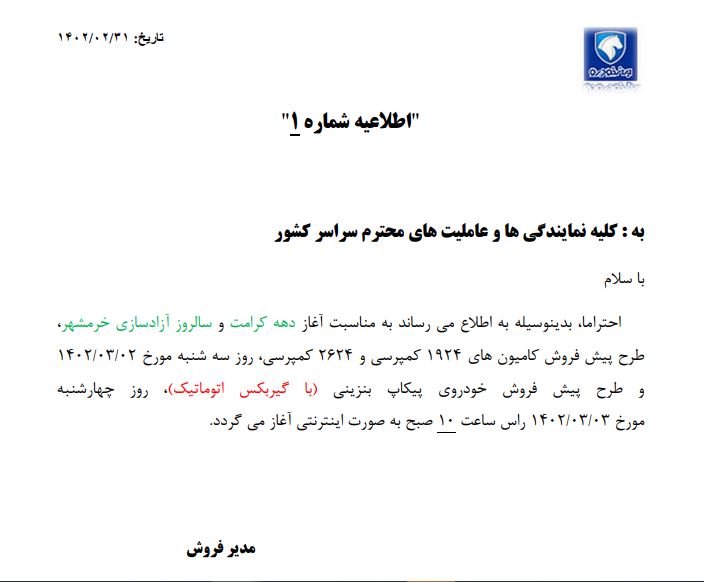 بر این اساس جدیدترین ثبت نام ایران خودرو دیزل از ساعت ۱۰ صبح روز سهشنبه دوم خردادماه آغاز خواهد شد. در روز دوم خرداد قرار است کامیونهای کمپرسی ۱۹۲۴ پیش فروش شود و پیشفروش پیکاپ تانلند فوتون اتوماتیک از ساعت ۱۰ صبح روز چهارشنبه سوم خردادماه ۱۴۰۲ شروع خواهد شد.